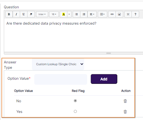 - The Option1Redflag, Option2Redflag, Option3Redflag, Option4Redflag, Option5Redflag, Option6RedflagOption7Redflag, Option8Redflag. Option9Redflag and Option10Redflag columns can be used to define the red flagged options as required, by entering either Y to signify that the option is flagged or N to signify that the option is not reg flagged. The flagged ones will need remediation upon selection during responding to the questionnaire.
